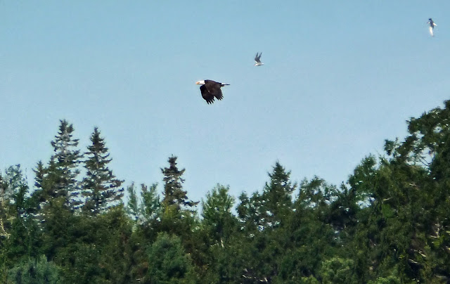 The resident bald eagle in Somes Harbor must have greatly upset a family of terns. Two terns, so small in size to the eagle, chased the much larger bird around the harbor one afternoon.